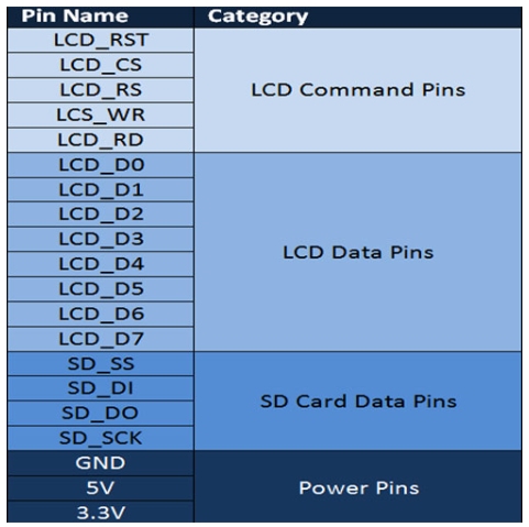正如你所看到的,28個引腳將完美地適合任何Arduino Uno / Arduino Mega板。TFT顯示引腳分為四個主要部分,即命令引腳,數(shù)據(jù)引腳,SD卡引腳和電源引腳。下表給出了這些引腳的一個小分類。