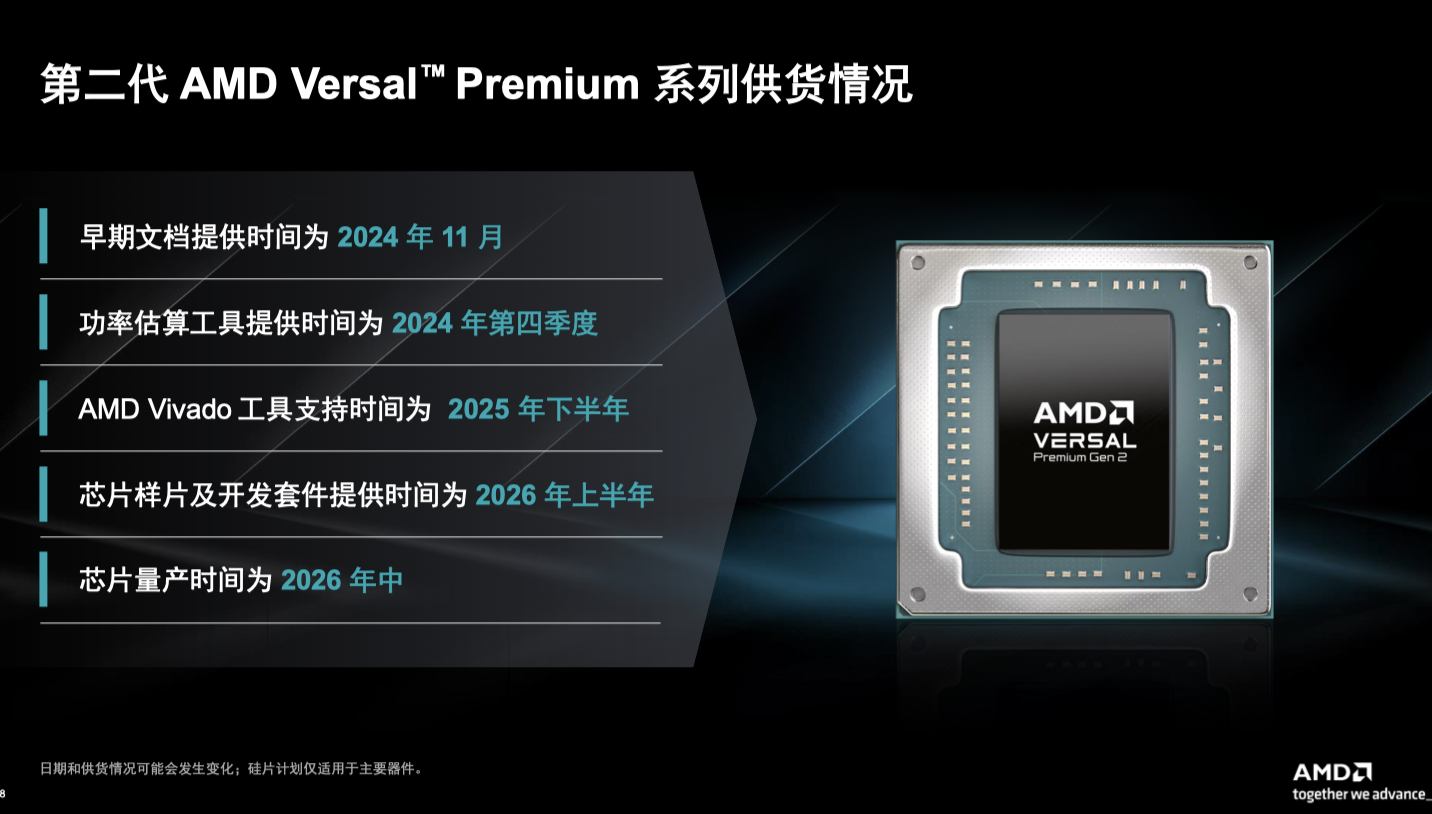 據(jù)悉,第二代AMD Versal? Premium系列提供四種不同型號(hào),邏輯單元從140萬(wàn)到330萬(wàn)不等,包含3300到7600個(gè)DSP引擎。并集成了片上內(nèi)存、內(nèi)存控制器、雙核A72應(yīng)用處理器、雙核R5F實(shí)時(shí)處理器、32至72個(gè)GTM2收發(fā)器、PCIe和CXL支持模塊、100G和600G以太網(wǎng)MAC、400G高速加密引擎以及LDPC解碼器。該系列將于2024年第四季度推出功率估算工具,2025年下半年提供完整的Vivado工具,2026年上半年發(fā)布芯片樣片和開(kāi)發(fā)套件,并在2026年中實(shí)現(xiàn)量產(chǎn)。