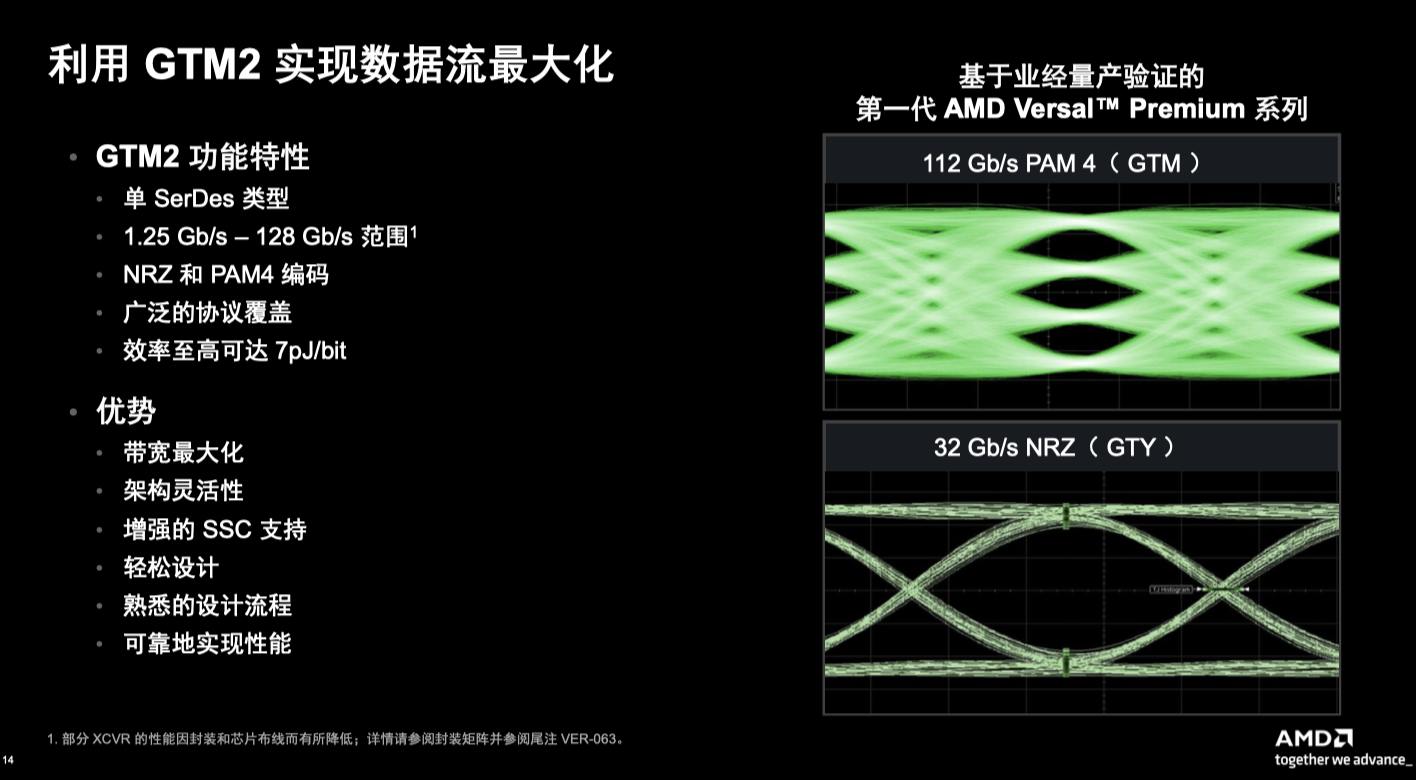值得一提的是,在第二代AMD Versal Premium系列中,創(chuàng)新性的GTM2收發(fā)器為系統(tǒng)性能再添助力。GTM2集成了上一代產(chǎn)品中的GTM和GTM1收發(fā)器,支持1.25 Gb/s至128 Gb/s的廣泛數(shù)據(jù)速率,并兼容NRZ與PAM4編碼格式。與此同時(shí),GTM2延續(xù)了上一代成熟的設(shè)計(jì)流程,使開(kāi)發(fā)者能夠輕松上手,并在系統(tǒng)的各個(gè)階段確保高度的可靠性。這一新型收發(fā)器的引入,進(jìn)一步強(qiáng)化了Versal Premium的高速數(shù)據(jù)傳輸能力,為開(kāi)發(fā)者帶來(lái)了可靠、靈活且強(qiáng)大的解決方案。