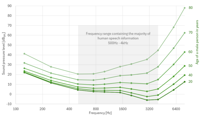 我們大多數(shù)人都知道,人類的聽力閾值會隨著年齡的增長而下降,如圖 2 所示。