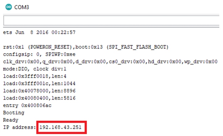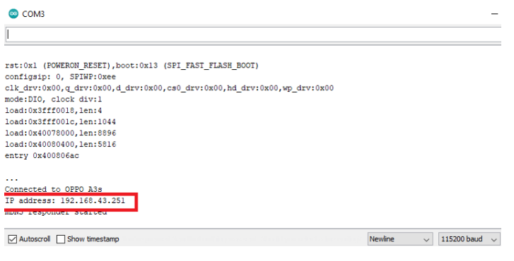 一旦你上傳了基本的OTA草圖。以115200的波特率打開串行監(jiān)視器。如果一切正常,那么您將在監(jiān)視器的末尾看到打印的IP地址。注意IP地址。
