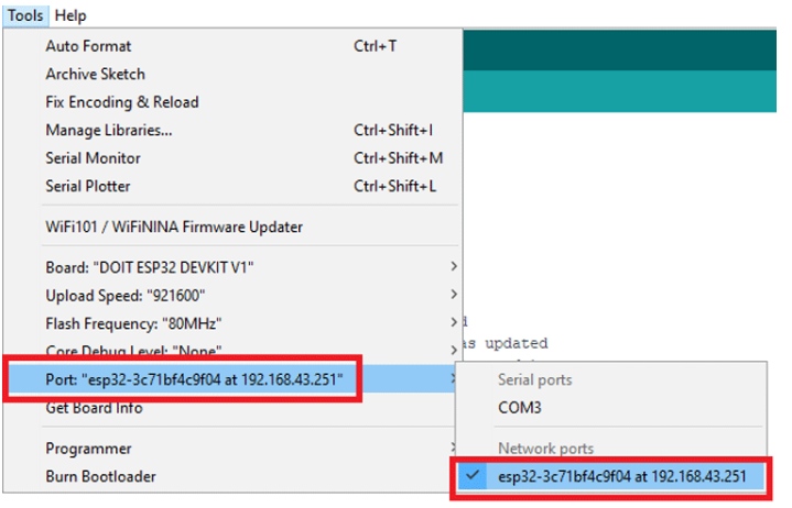 一旦您以包含基本OTA草圖的方式編寫了程序,那么只需單擊Tools并轉(zhuǎn)到ports部分。您將看到類似于“esp32-xxxxxx at your_esp_ip_address”的內(nèi)容,選擇該板并點(diǎn)擊上傳按鈕。