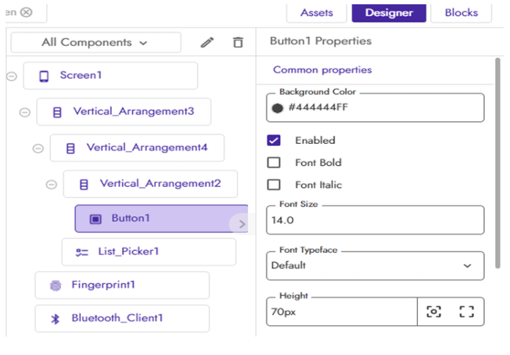 命名應(yīng)用程序并單擊“完成”。項(xiàng)目將被創(chuàng)建,您將被帶到項(xiàng)目的設(shè)計(jì)器頁面。現(xiàn)在在Designer頁面上,從components Palette中添加這四個(gè)組件來創(chuàng)建應(yīng)用程序的布局:Bluetooth Client, Fingerprint, List Picker和Image Button。列表選擇器和按鈕可以在“用戶界面”中找到,而指紋和藍(lán)牙可以從“傳感器”和“連接”中選擇。