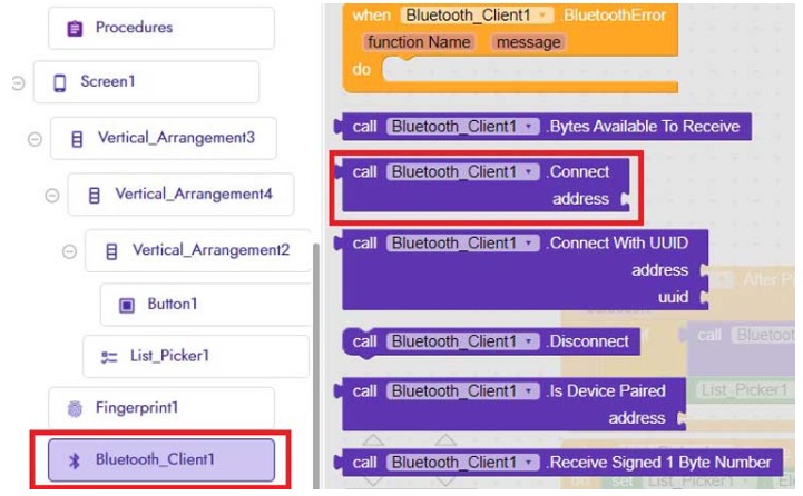 之后,轉(zhuǎn)到“Bluetooth_client1”塊并選擇“Bluetooth_client”。連接代碼塊。