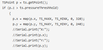 現(xiàn)在,在代碼的第二部分中,我們將檢測按鈕接觸點,然后使用這些點來預(yù)測按鈕。. ts.getPoint()函數(shù)用于檢測TFT顯示器上的用戶觸摸。ts.getPoint給出了觸摸區(qū)域的原始ADC值。然后使用地圖函數(shù)將這些RAW ADC值轉(zhuǎn)換為像素坐標。