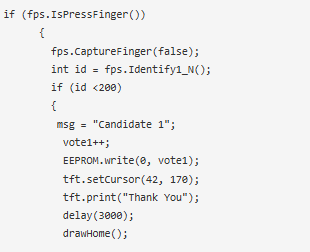 要測試該項目,將Arduino Uno連接到筆記本電腦并上傳以下給定代碼。一旦代碼上傳,TFT顯示應(yīng)該顯示候選人的名字。當有人點擊候選人的名字時,機器會要求掃描指紋掃描儀。如果指紋是有效的,那么用戶投票將被計數(shù),但如果模式與數(shù)據(jù)庫的記錄不匹配,則投票的訪問將被拒絕。每個候選人的總票數(shù)將被存儲在EEPROM中,票數(shù)最高的候選人將獲勝。