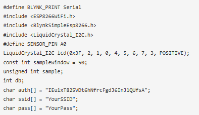 在這里,我們必須開發(fā)一個代碼,從聲音傳感器獲取輸入并將其值映射到分貝,在比較響度之后,它不僅應該將其打印到16*2 LCD顯示器上,還應該將其發(fā)送到Blynk服務器。