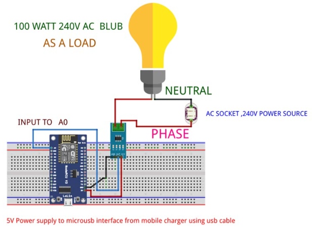 正如您所看到的,NodeMCU將通過USB端口使用5V移動(dòng)充電器供電,交流負(fù)載將通過我們的ACS712電流傳感器連接到220V交流電源。