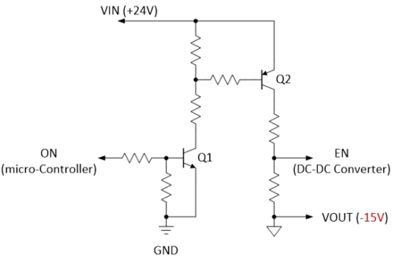 圖 3顯示了典型的電平轉(zhuǎn)換器電路。其目的是移動(dòng)信號(hào)的接地參考以匹配系統(tǒng) MCU 的接地參考。它在這里用于翻譯來自系統(tǒng) MCU 的 ON 命令以打開/關(guān)閉 DC-DC 轉(zhuǎn)換器。該電平轉(zhuǎn)換器由 9 個(gè)組件組成。其操作非常簡(jiǎn)單:當(dāng)系統(tǒng)控制器將 ON 驅(qū)動(dòng)為高電平時(shí),Q1 導(dǎo)通,進(jìn)而偏置 Q2,并將 EN 驅(qū)動(dòng)為高電平以啟用 DC-DC 轉(zhuǎn)換器。當(dāng) ON 被驅(qū)動(dòng)為低電平時(shí),Q1 和 Q2 均關(guān)閉,EN 被驅(qū)動(dòng)為低電平以禁用轉(zhuǎn)換器。