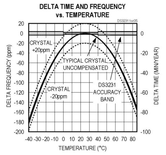 下面是一個帶有集成 TCXO 和晶體的 RTC 示例。DS3231SN 的精度規(guī)格在 -40° 至 85°C 的整個工作溫度范圍內(nèi)支持最高 3.5 ppm,但在 0° 至 40°C 的整個工作溫度范圍內(nèi)僅支持 2 ppm。圖 1顯示了顯示 TCXO 和典型晶體振蕩器之間精度差異的圖。