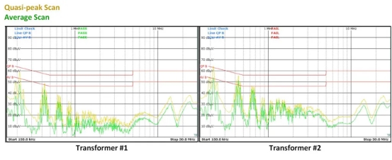 圖 5變壓器的傳導(dǎo) EMI 測(cè)試結(jié)果,其中變壓器 #1 通過了裕量,而變壓器 #2 幾乎沒有失敗。