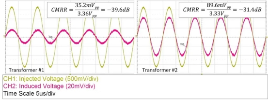 圖 3時(shí)域變壓器 CMRR 測(cè)試結(jié)果表明,在 100 kHz 的測(cè)試頻率下,變壓器 #1 產(chǎn)生的共模噪聲低于變壓器 #2。