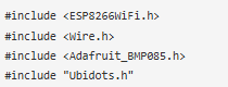 因此,從包含所有必需的庫(kù)開(kāi)始編寫(xiě)代碼。Adafruit_BMP085.h庫(kù)用于讀取BMP傳感器數(shù)據(jù),Ubidots.h庫(kù)用于通過(guò)HTTP協(xié)議向Ubidots平臺(tái)發(fā)送數(shù)據(jù)。
