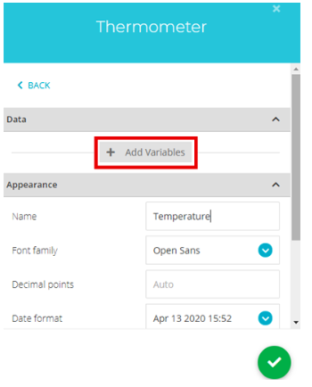 然后單擊Finish。對(duì)Pressure和Altitude變量重復(fù)相同的過(guò)程,但不是選擇溫度計(jì)小部件,而是選擇‘ Gauge ’小部件。