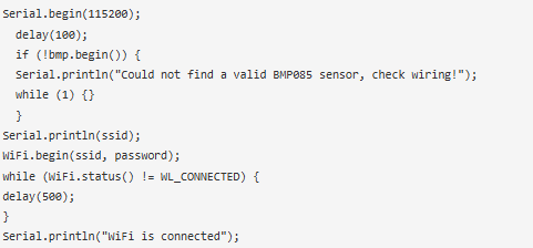 在void setup()函數(shù)中,使用.begin()函數(shù)初始化波特率和BMP180,然后將模塊與Wi-Fi連接。
