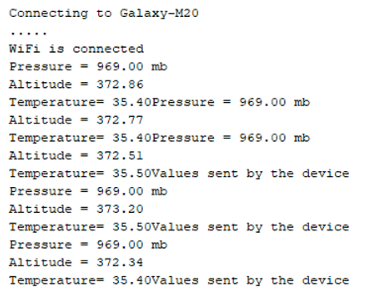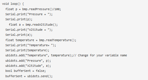 現(xiàn)在在void循環(huán)中,從BMP180傳感器讀取溫度、壓力和海拔高度值,并將這些值存儲(chǔ)在不同的變量中。之后,將這些讀數(shù)發(fā)送到Ubidots平臺(tái)。
