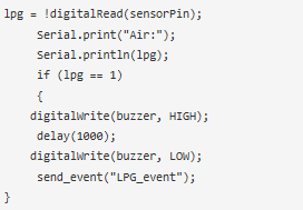 現(xiàn)在,在真空回路中,MQ-5傳感器可以進(jìn)行數(shù)字讀取,如果檢測到LPG氣體,則將蜂鳴器設(shè)為HIGH一秒鐘,并使用IFTTT Webhooks服務(wù)發(fā)送觸發(fā)郵件。