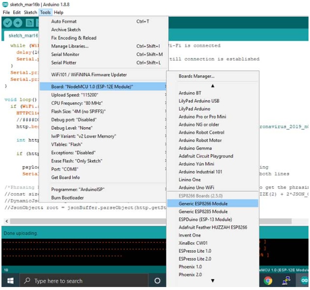 現(xiàn)在啟動Arduino Uno并打開Arduino IDE。選擇“Generic ESP8266 Module”板內(nèi)類型并上傳代碼。