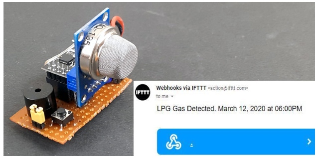 當(dāng)MQ-5氣體傳感器檢測到氣體時,ESP8266-01觸發(fā)蜂鳴器,并通過IFTTT Webhooks發(fā)送警告郵件。