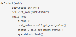 現(xiàn)在創(chuàng)建一個(gè)帶有三個(gè)函數(shù)的LoRa類,即init、class和on_rx_done。init函數(shù)用于初始化433MHz帶寬為125khz的LoRa模塊。