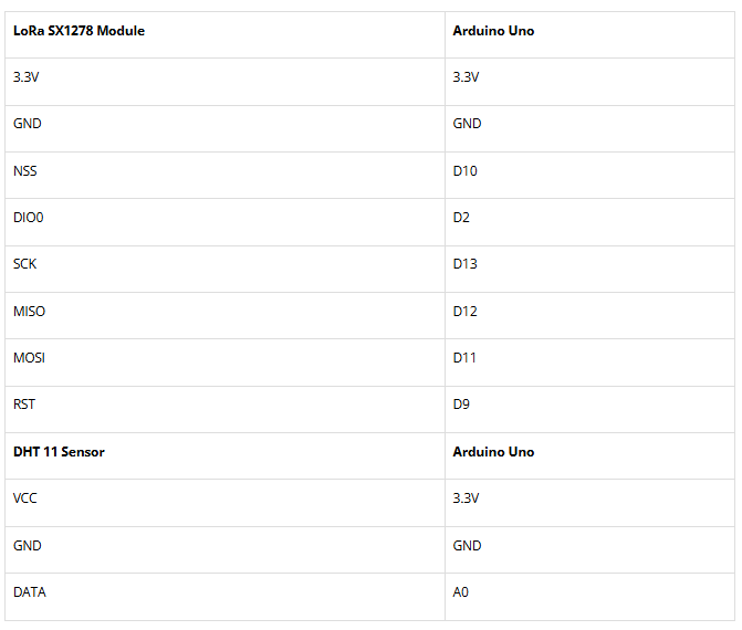 LoRa模塊由16個(gè)引腳組成,其中6個(gè)引腳是GPIO引腳,4個(gè)是接地引腳。這個(gè)LoRa模塊工作在3.3V,因此LoRa上的3.3V引腳連接到Arduino UNO板上的3.3V引腳。下表給出了完整的連接。DHT11傳感器連接到Arduino的A0引腳。