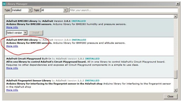 包括Adafruit_BMP280.h單擊Arduino IDE中的草圖,然后去包括庫(kù)->管理庫(kù)和搜索Adafruit BMP280,從列表中選擇第一個(gè)搜索結(jié)果并單擊安裝。