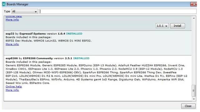 3. 現(xiàn)在轉(zhuǎn)到Tools > Board > Boards Manager。在“單板管理器”窗口中,在搜索框中輸入ESP8266,選擇最新版本的單板,單擊“安裝”。