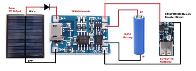 這里的NodeMCU由太陽(yáng)能電池板供電。18650電池的輸出為(3.7-4)伏,不能用于為NodeMCU供電,因?yàn)樗枰?v才能上電。因此TP4056鋰離子充電器的輸出連接到(0.9-5)V DC-DC升壓電路,將電壓升壓到5v。