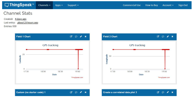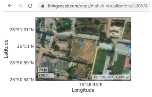 一旦啟動nodeMCU,串行監(jiān)視器中看到的讀數(shù)可能不正確。它需要一些有限的時(shí)間來得到正確的讀數(shù)。如果GPS模塊開始閃爍,您將知道讀數(shù)是正確的。一旦nodeMCU與LAN連接,并且GPS數(shù)據(jù)有效,則該數(shù)據(jù)將被發(fā)送到thingspeak。您可以在Thingspeak的字段中查看正在更新的數(shù)據(jù)。通過使用我們在Matlab可視化中獲得的生成的URL,我們可以從任何瀏覽器跟蹤位置。
