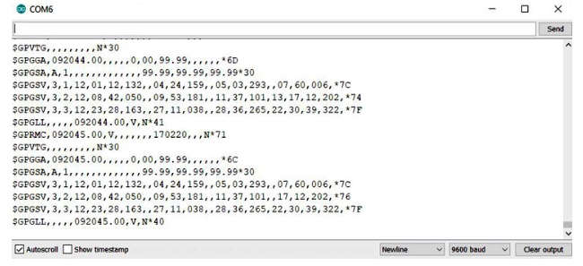 上傳空代碼后,打開串口監(jiān)視器。到目前為止,您應(yīng)該看到屏幕上打印了一些值。等等,它們不是正確的值。如果您觀察,您可以發(fā)現(xiàn)輸出中缺少一些位。首先,模塊需要一些時(shí)間才能給出正確的值。注意:如果GPS模塊開始閃爍,則表示該模塊正在接收值。下圖顯示了接收到的數(shù)據(jù)中缺少一些位的情況。