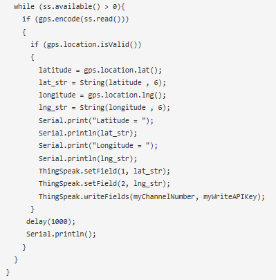 以下代碼僅在有來自GPS模塊的傳入數(shù)據(jù)時(shí)運(yùn)行。代碼對數(shù)據(jù)進(jìn)行編碼,如果編碼后的數(shù)據(jù)有效,則考慮該數(shù)據(jù),并進(jìn)行進(jìn)一步的計(jì)算以將NMEA數(shù)據(jù)轉(zhuǎn)換為可理解的數(shù)據(jù)。下面的代碼只向thingspeak發(fā)送緯度和經(jīng)度值。