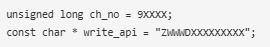 接下來,聲明ThingSpeak帳戶憑據(jù),如通道號和之前記錄的寫入API。
