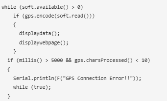 在loop()中,encode()用于確保接收到有效的GPS語句。當(dāng)encode()返回“true”時,一個有效的句子剛剛改變了TinyGPS對象的內(nèi)部狀態(tài)。當(dāng)encode()返回true時,調(diào)用兩個函數(shù)displaydata()和display網(wǎng)頁()。