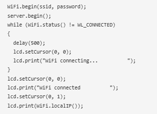 要將NodeMCU連接到互聯(lián)網(wǎng),請調(diào)用WiFi。開始并傳遞網(wǎng)絡(luò)SSID和密碼作為參數(shù)。使用WiFi.status()檢查網(wǎng)絡(luò)連接是否成功,連接成功后,在LCD上打印帶有IP地址的消息。