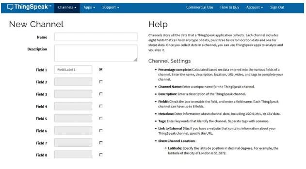 用你的憑證登錄ThingSpeak,然后點(diǎn)擊“新頻道”。現(xiàn)在填寫項(xiàng)目的詳細(xì)信息,如名稱、字段名稱等。這里我們必須創(chuàng)建兩個字段名,如Latitude和Longitude。然后點(diǎn)擊“保存頻道”。