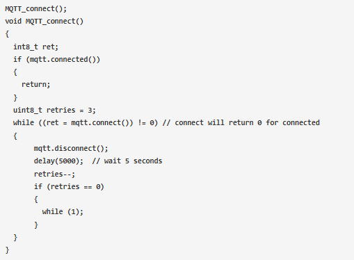 下面給出的代碼處理MQTT連接。MQTT連接的主程序編寫在一個單獨的函數(shù)中,該函數(shù)名為MQTT_connect()。使用MQTT_connect()函數(shù)調(diào)用MQTT程序,該函數(shù)存在于void循環(huán)中。