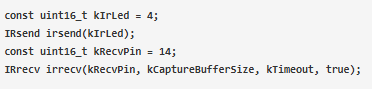 我們將引腳4(D2)和引腳14(D5)分配給klrLed和kRecvPin變量,并使用D2引腳發(fā)送紅外數(shù)據(jù),而D5引腳用于接收紅外數(shù)據(jù)