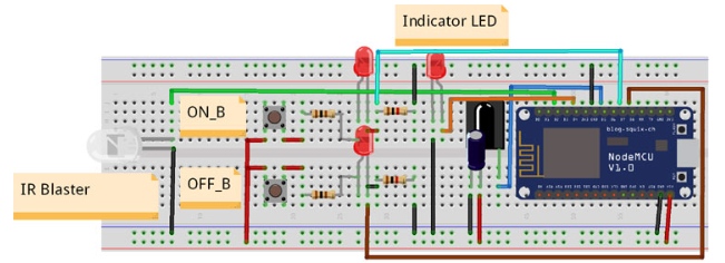 我們使用一個簡單的紅外led作為紅外爆破器,其陽極連接到NodeMCU的D2引腳,陰極端子連接到GND。為了顯示按鈕是否被按下,我對每個按鈕都使用了LED。在按鈕和led之間,我使用了一個100歐姆的電阻。物聯(lián)網(wǎng)控制的交流遙控器的完整電路圖如下所示。