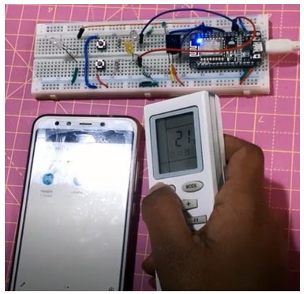 當我們打開電源時,我們會注意到指示燈LED(綠色LED)會閃爍。這表示模塊正在等待wifi連接。指示燈停止閃爍,表示nodeMCU已連接wifi網(wǎng)絡。在建立網(wǎng)絡連接后,要捕獲紅外數(shù)據(jù),請持續(xù)按下連接到D7或D8的按鈕(ON_B或OFF_B),直到指示燈LED開始發(fā)光。指示燈LED發(fā)光,表示nodeMCU準備采集紅外數(shù)據(jù)。使用您的AC遙控器發(fā)送紅外信號到我們的TSOP如下所示。如果紅外數(shù)據(jù)正確且無噪聲,則指示燈滅亮,表示NodeMCU成功捕獲紅外數(shù)據(jù),可以重新模擬數(shù)據(jù)。