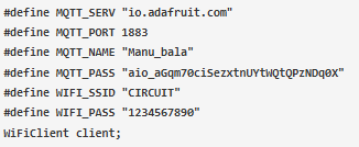 下面給出的代碼為地址、名稱、端口號、密碼、SSID和wifi密碼定義了一個變量。服務器地址和端口號可以保持原樣,但是必須更改AIO密鑰中獲得的MQTT NAME和MQTT PASS。