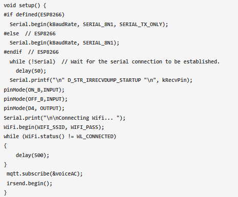 在void設置中,我們初始化波特率,并且必須等待微控制器形成串行連接。串行通信用于調(diào)試目的。建立連接后,我們將引腳D7(ON_B)和D8(OFF_B)設置為輸入引腳,D4引腳設置為輸出。引腳D7和D8用于查找連接到這些引腳的開關是否處于ON狀態(tài)或OFF狀態(tài)。引腳D4用于連接LED, LED進一步用作指示燈。將這些引腳配置為輸入和輸出引腳后,我們就建立了與家庭網(wǎng)絡的連接。建立連接后,我們通過MQTT協(xié)議訂閱VoiceAC饋線,并通過irsend.begin初始化發(fā)送函數(shù)。