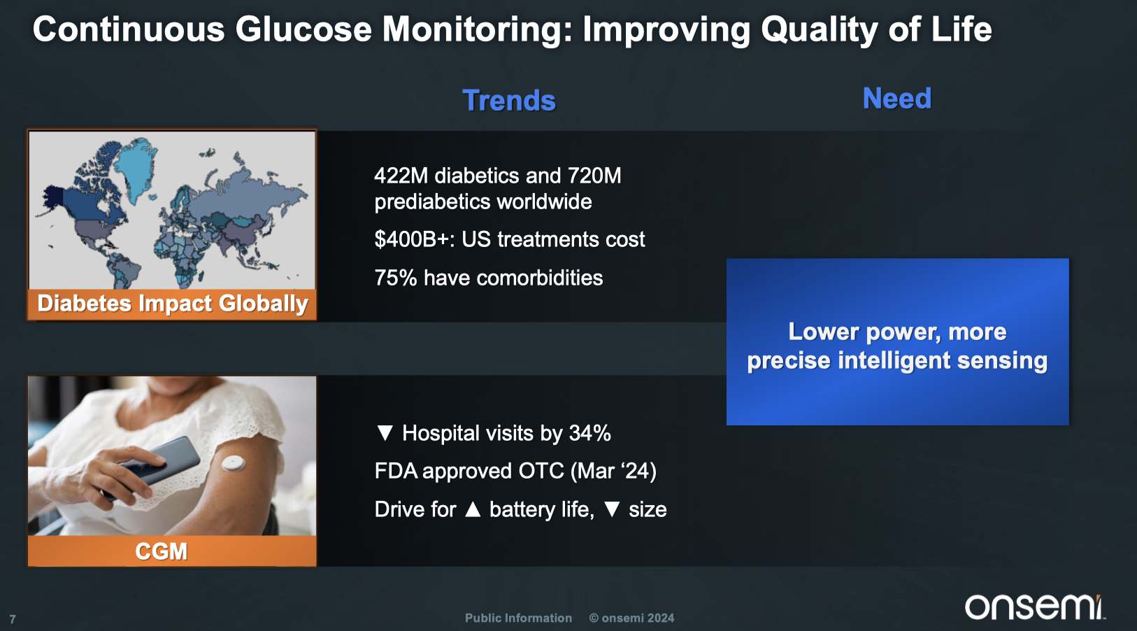 CGM(連續(xù)血糖監(jiān)測)市場的快速發(fā)展也為Treo平臺提供了機(jī)會。隨著FDA批準(zhǔn)非處方CGM設(shè)備的銷售,全球糖尿病患者的龐大需求推動了CGM設(shè)備的廣泛使用。目前,全球已有4.22億糖尿病患者,預(yù)計(jì)隨著更多前期糖尿病患者進(jìn)入市場,CGM設(shè)備的需求將大幅增長。安森美已經(jīng)與全球前三大CGM廠商建立了合作關(guān)系,其平臺支持的AFE(模擬前端)方案在這些廠商的產(chǎn)品中得到了廣泛應(yīng)用。通過提供硬件支持,安森美使得這些設(shè)備廠商能夠更容易地實(shí)現(xiàn)其功能,尤其是在可穿戴設(shè)備日益受到關(guān)注的背景下,安森美的平臺為更多功能的集成提供了硬件基礎(chǔ),確保了超低功耗和小體積的需求。