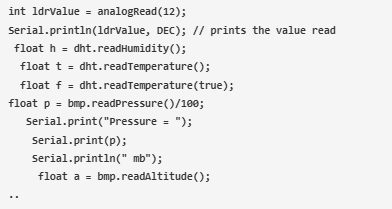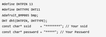 然后,初始化變量并為DHT11、BMP180、Wi-Fi名稱、Wi-Fi密碼和代碼中使用的其他一些變量創(chuàng)建實例。