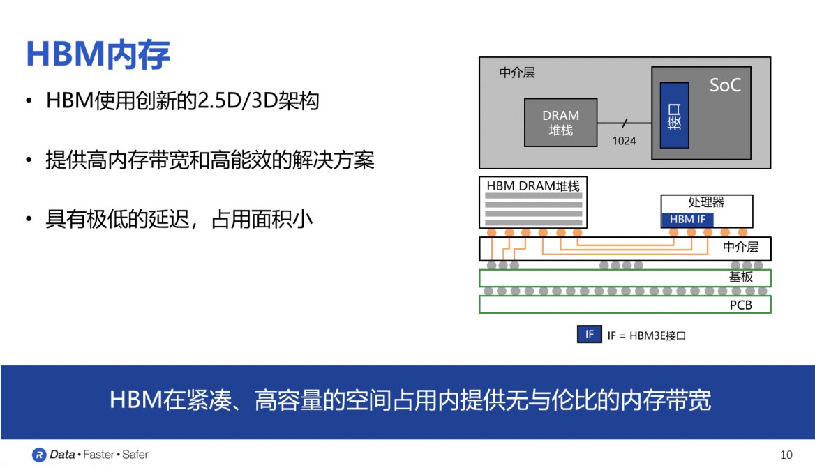 作為內(nèi)存設(shè)備與處理器之間的橋梁,為了滿足這些高密度信號(hào)需求,HBM3采用了硅中介層技術(shù)。硅中介層能夠在極小的空間內(nèi)蝕刻出更多的信號(hào)路徑,從而支持更高的帶寬需求,并保證數(shù)據(jù)傳輸?shù)母咝院头€(wěn)定性。這種精密的設(shè)計(jì)使得HBM內(nèi)存不僅能提供更高的帶寬和容量,還能顯著降低延遲,優(yōu)化了能效,并將內(nèi)存占用面積最小化。因此,HBM內(nèi)存在需要極高數(shù)據(jù)吞吐量和低延遲的應(yīng)用場(chǎng)景中,尤其是在AI訓(xùn)練和高性能計(jì)算領(lǐng)域,發(fā)揮著重要作用。