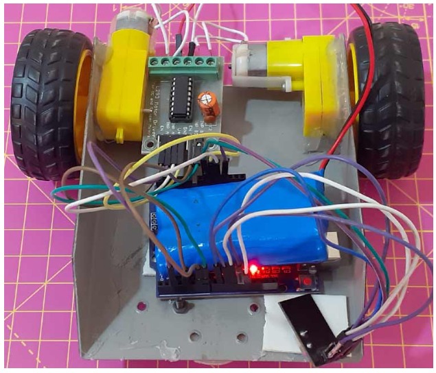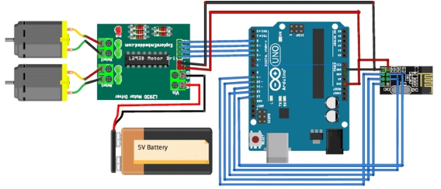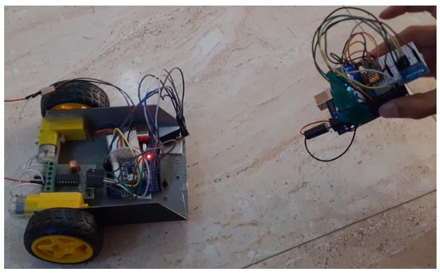 第二部分是Receiver部分(Robot car), nRF接收器接收傳輸?shù)臄?shù)據(jù)并將其發(fā)送給Arduino,由Arduino進(jìn)一步處理并據(jù)此移動(dòng)機(jī)器人。