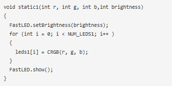 Static1()函數(shù)用于驅(qū)動(dòng)LED燈條,控制LED燈條的亮度。和FastLED。setBrightness用于設(shè)置LED的亮度。同樣FastLED。顯示功能用于根據(jù)需要的顏色驅(qū)動(dòng)LED。