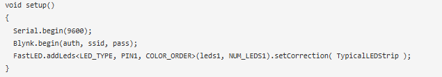 在setup()函數(shù)中,使用serial初始化串行通信。使用Blynk.begin開(kāi)始并連接到Blynk云。另外,使用FastLED.addLeds設(shè)置LED的類(lèi)型和數(shù)量。