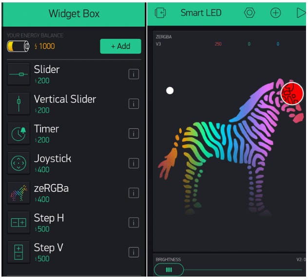 在Blynk中打開(kāi)項(xiàng)目,單擊“+”符號(hào)來(lái)添加控件來(lái)控制NeoPixel。在我們的例子中,我們需要一個(gè)RGB顏色選擇器,它被列為“zeRGBa”和一個(gè)滑塊,將用于LED條的亮度控制。
