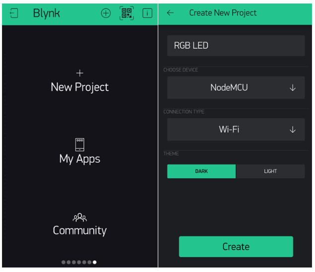 安裝成功后,打開(kāi)應(yīng)用程序,點(diǎn)擊“新建項(xiàng)目”。然后它將彈出一個(gè)新屏幕,我們需要在其中設(shè)置項(xiàng)目名稱(chēng)、Board和連接類(lèi)型等參數(shù)。對(duì)于這個(gè)NeoPixel ESP8266項(xiàng)目,選擇設(shè)備為NodeMCU,連接類(lèi)型為Wi-Fi,然后點(diǎn)擊“創(chuàng)建”。