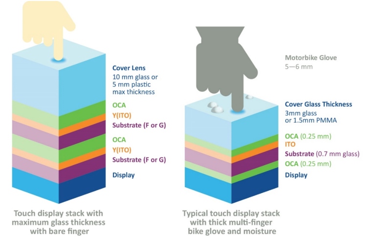 兩輪電動車的觸摸屏經(jīng)常暴露在惡劣的戶外環(huán)境中,容易受到雨雪、灰塵或泥沙等的侵襲。在氣候炎熱的地區(qū),兩輪電動車有時會停放在有陽光直射的地方,受到強(qiáng)烈的紫外線和紅外線照射。此外,它們還容易發(fā)生事故或遭到人為破壞。考慮到這些因素,兩輪電動車適合采用IP65/68防護(hù)等級的觸摸屏和厚蓋板玻璃,以保護(hù)下方的觸摸傳感器和LCD或OLED顯示元件。為防止陽光和紫外線照射,需要采用紫外線/紅外線過濾器,同時還要應(yīng)用防反射/防眩光涂層來提高所有照明條件下顯示屏的可視性。因此,顯示屏疊層需要很厚的分層設(shè)計(jì),每增加一層,都會使手指與電容式觸摸傳感器的距離更遠(yuǎn)。距離越遠(yuǎn),就越難以準(zhǔn)確檢測屏幕表面的觸摸操作。